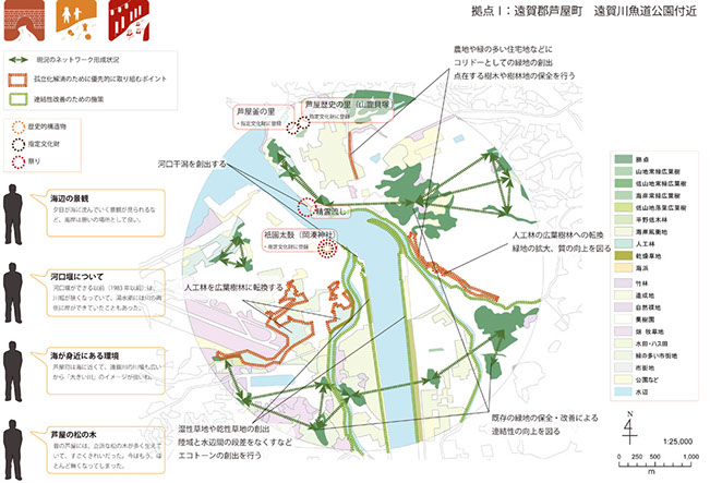 本プロジェクトでは、遠賀川の流域景観について、生物多様性保全や生態系ネットワークなどの生態学的視点、地域の人々の意識や感覚を認識する視点、歴史・文化景観保全の視点、それぞれの視点から、流域景観を捉えなおし、総合的に評価しました。その後、ゾーニングを行い、今後の流域景観形成の指針の提案を行っています。