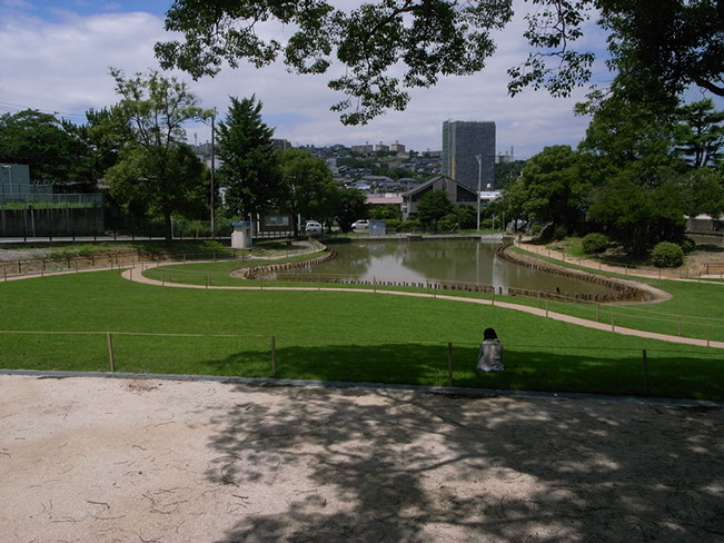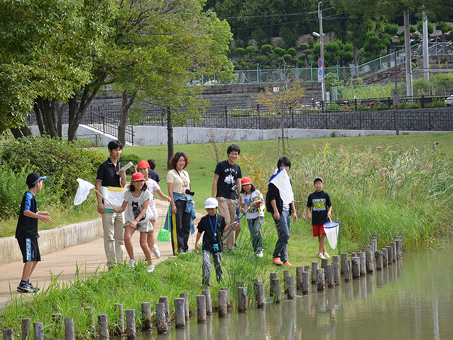 夜宮公園巡り坂池は北九州市戸畑区に位置する公園です。改修前の巡り坂池は、コンクリート三面張りの池で、親水性と生物多様性の低い環境となっていました。北九州市からの依頼を受け、2008年に九州工業大学環境デザイン研究室・北九州市立天籟寺小学校・北九州市戸畑区役所まちづくり整備課の協働による改修設計プロジェクトが始まりました。このプロジェクトでは、「記憶と人、自然のゆるやかなつながりの再生」をコンセプトに、天籟寺小学校の子どもたちや先生、地域の方々とのワークショップを重ねながら、改修設計を行いました(2008年度~2009年度)。2010年に改修工事が完了し、様々な生物が生息できる緩やかな水辺と、過去の地歴をもとに設計した起伏のある原っぱのある空間が創出されました。施工完了後は、自然再生により様々な生物が生息するようになった巡り坂池の環境を活用して、地域の小学生や高校生を対象とした環境学習の取り組みを進めてきました(2010年度~2014年度)。現在は、人々の憩いの場として、子どもたちの自然遊びの場として地域のなかで重要な場所となっています。環境デザイン研究室では、巡り坂池の自然環境モニタリングを現在も継続して実施し、自然再生のプロセスと都市の生態系について研究をすすめています。